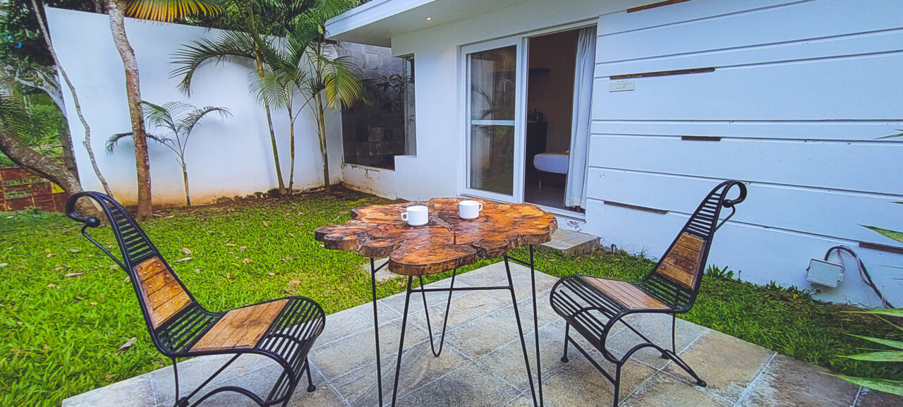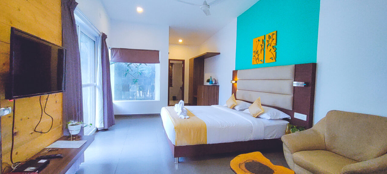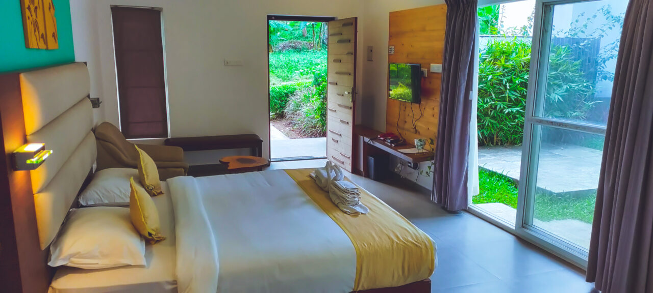 These spacious 450-square feet rooms are fully loaded with contemporary wanderlust in mind. The classic villa draws inspiration from Contemporary style houses – the open-to-sky showers and private courtyard gardens are exquisite features. Be charmed by the large windows, which offer a spectacular view of the rainforest and the farm behind. The view makes the room look much larger. The stylish, stone-clad bathrooms beckon with an invigorating rain shower. It’s a perfect choice for the honeymoon couple. Sitting in the lap of the valley the classic villa – blooming woods are veiled by the shadows of three mountains. It has a covered deck that will make you just sit and admire the picturesque surrounding amidst the sounds of nature around you. The bathing areas extend to an open-to-sky-shower area which washes away all the stress and pain in your body and relaxes the mind. The bed facing the private garden has a deep forest view on the other side and a huge barbeque space within. All the rooms in this category have a tea/coffee maker, room service, and television with satellite programs.